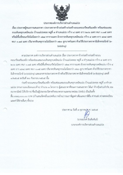 ประกาศผู้ชนะการเสนอราคา ประกวดราคาจ้างก่อสร้างก่อสร้างถนนคอนกรีตเสริมเหล็ก พร้อมซ่อมแชม ถนนหินคลุกบดอัดแน่น บ้านแม่ปะดอย หมู่ที่ ๗ ฯ ด้วยวิธีประกวดราคาอิเล็กทรอนิกส์ (e- bidding)