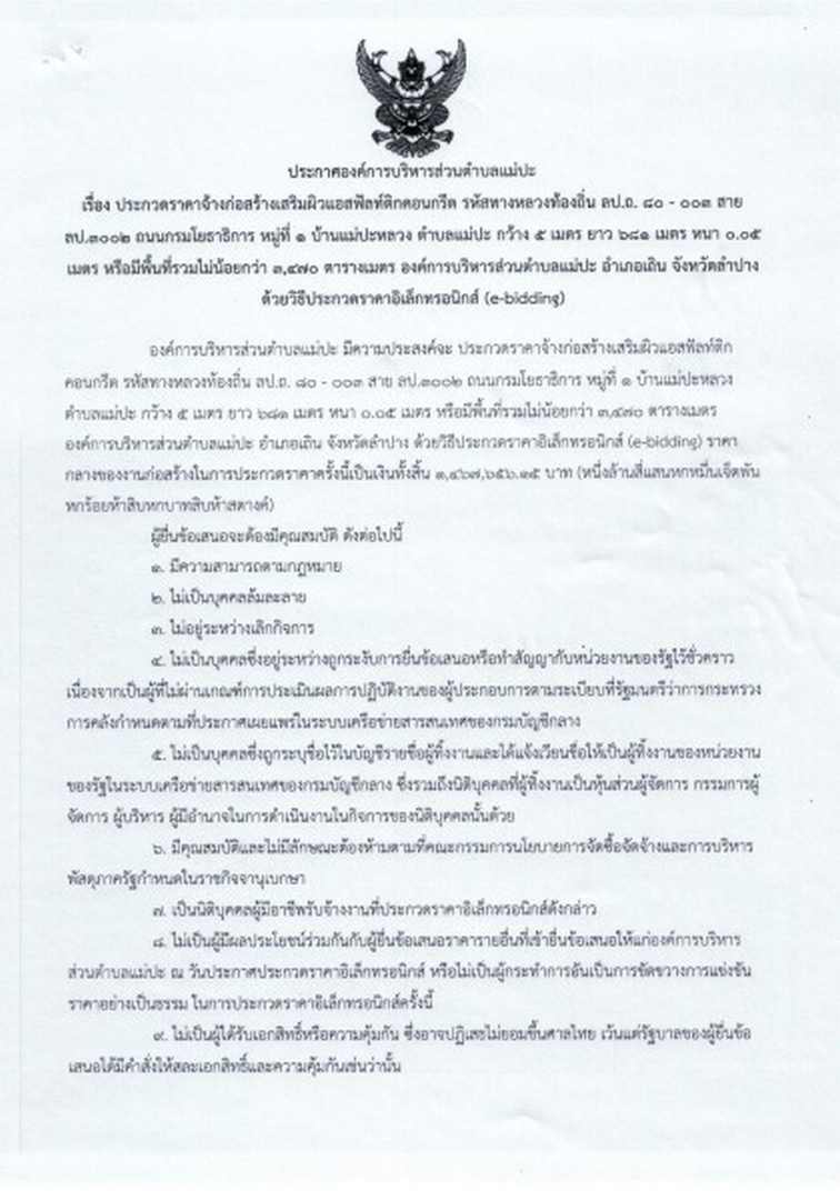 ประกวดราคาจ้างก่อสร้างเสริมผิวแอสฟัลท์ติกคอนกรีต รหัสทางหลวงท้องถิ่น ลป.ถ. ๘๐ - ๐๐๓ สาย ลป.๓๐๐๒ ถนนกรมโยธาธิการ หมู่ที่ ๑ บ้านแม่ปะหลวง ฯ (e-bidding)