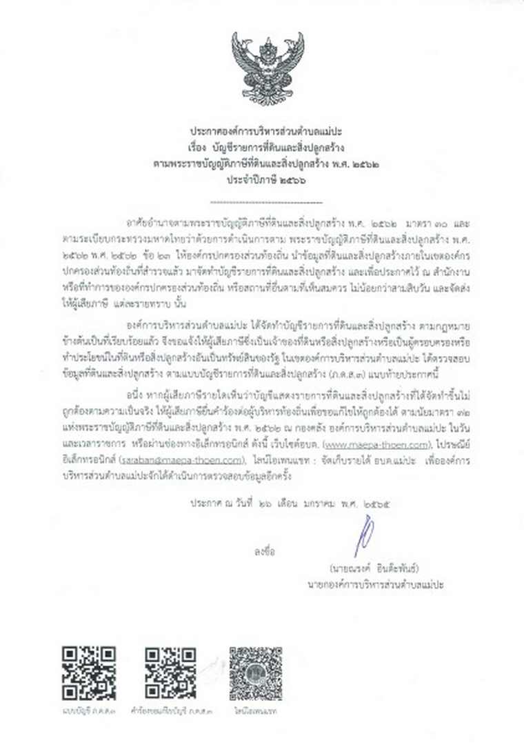 บัญชีรายการที่ดินและสิ่งปลูกสร้าง ตามพระราชบัญญัติภาษีที่ดินและสิ่งปลูกสร้าง พ.ศ. ๒๕๖๒ ประจำปีภาษี ๒๕๖๖
