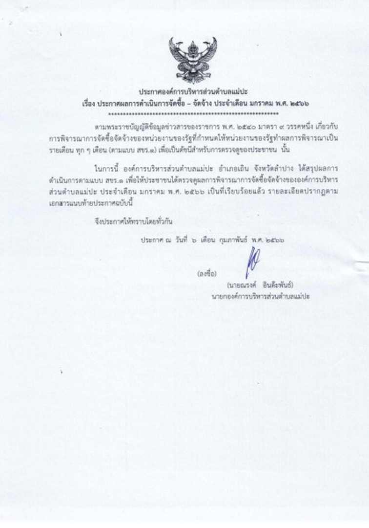 ประกาศผลการดำเนินการจัดซื้อ - จัดจ้าง ประจำเดือน มกราคม พ.ศ. ๒๕๖๖