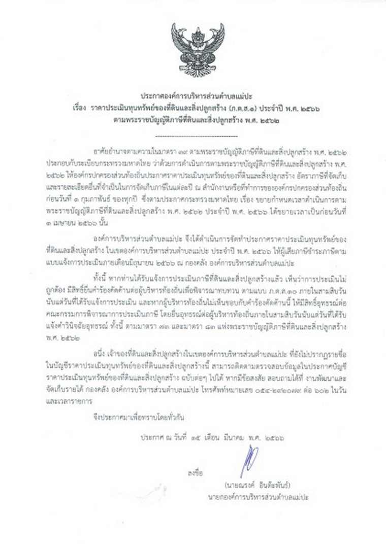 ราคาประเมินทุนทรัพย์ของที่ดินและสิ่งปลูกสร้าง (ภ.ด.ส.๑) ประจำปี พ.ศ. ๒๕๖๖ ตามพระราชบัญญัติภาษีที่ดินและสิ่งปลูกสร้าง พ.ศ. ๒๕๖๒