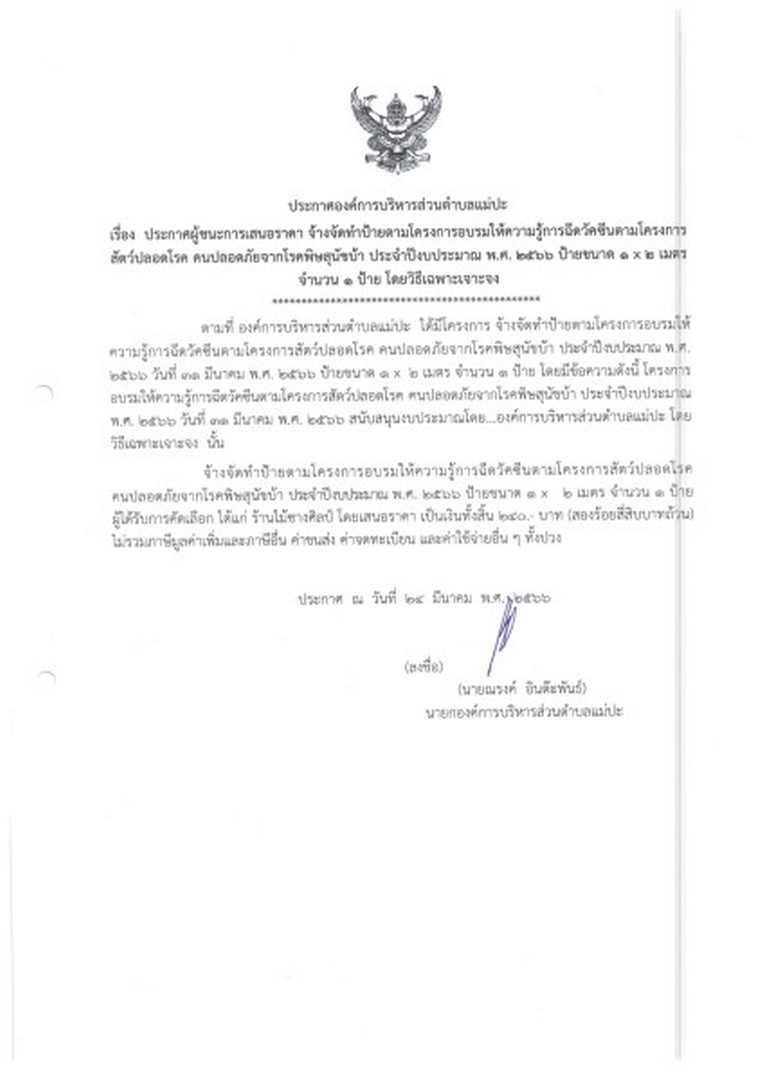 ประกาศผู้ชนะการเสนอราคา ๒๔ มีนาคม พ.ศ.๒๕๖๖ - วันที่ ๓๑ พฤษภาคม พ.ศ.๒๕๖๖