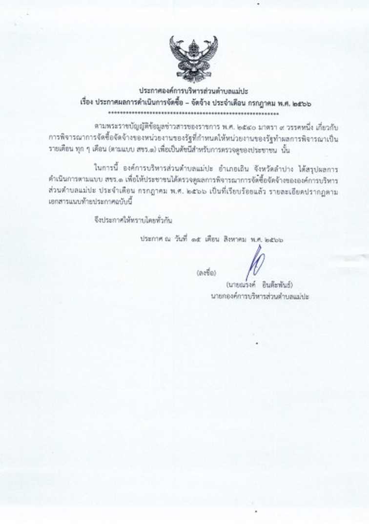 ประกาศผลการดำเนินการจัดซื้อ - จัดจ้าง ประจำเดือน กรกฎาคม พ.ศ. ๒๕๖๖
