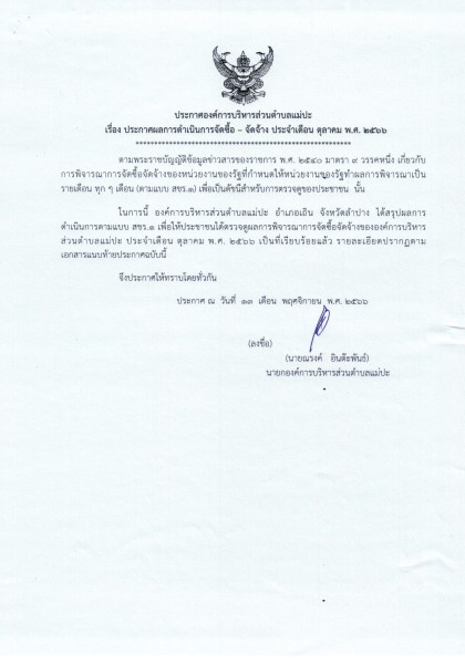 ประกาศผลการดำเนินการจัดซื้อ - จัดจ้าง ประจำเดือน ตุลาคม พ.ศ. ๒๕๖๖