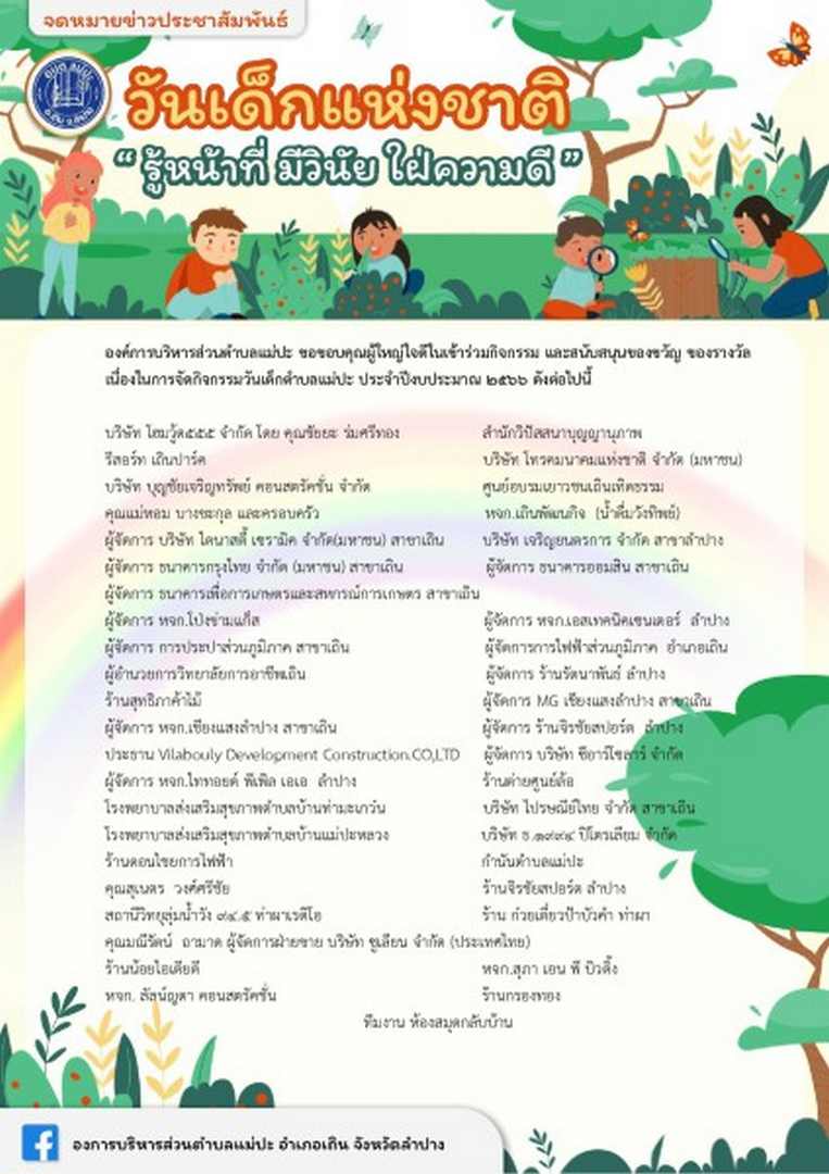จดหมายข่าวประชาสัมพันธ์ ขอพรระคุณผู้ใหญ่ใจดีในเข้าร่วมกิจกรรม และสนับสนุนของขวัญ ของรางวัล เนื่องในการจัดกิจกรรมวันเด็กตำบลแม่ปะ ประจำปีงบประมาณ 2566