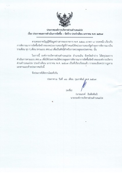 ประกาศผลการดำเนินการจัดซื้อ - จัดจ้าง ประจำเดือน มกราคม พ.ศ. ๒๕๖๗