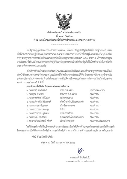 คำสั่งแต่งตั้งคณะทำงานเพื่อให้คำปรึกษาตอบคำถามทางจริยธรรม ปีงบประมาณ พ.ศ. 2567