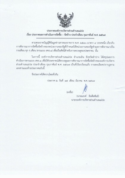 ประกาศผลการดำเนินการจัดซื้อ - จัดจ้าง ประจำเดือน กุมภาพันธ์ พ.ศ. ๒๕๖๗