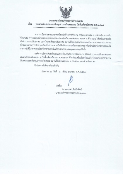 รายงานเงินสะสมและเงินทุนสำรองเงินสะสม ณ วันสิ้นเดือนมีนาคม พ.ศ.๒๕๖๗