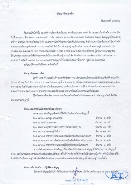 สัญญาจ้างก่อสร้าง สัญญาเลขที่ ๔/๒๕๖๖ ลงวันที่ ๑๓ กุมภาพันธ์ พ.ศ.๒๕๖๖ เรื่อง ผู้ว่าจ้างตกลงจ้างและผู้รับจ้างตกลงรับจ้างทำงาน ปรับปรุงถนนโดยการเสริมผิวแอสฟัลท์ติกคอนกรีต (ถนนภายในหมู่บ้าน) จำนวน ๒ ช่วง บ้านแม่ปะหลวง หมู่ที่ ๑ ฯ โดยวิธีเฉพาะเจาะจง