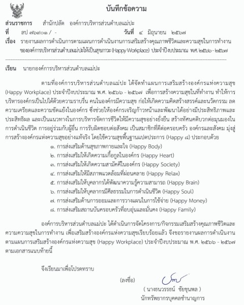 รายงานผลการดำเนินการตามแผนการเสริมสร้างองค์กรแห่งความสุข องค์กรสุขภาวะ (Happy Workplace)