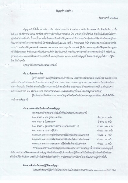 สัญญาจ้างก่อสร้าง สัญญาเลขที่ ๑/๒๕๖๗ ลงวันที่ ๑๖ พฤศจิกายน พ.ศ.๒๕๖๖ เรื่อง ผู้ว่าจ้างตกลงจ้างและผู้รับจ้างตกลงรับจ้างทำงาน โครงการก่อสร้างพนังป้องกันตลิ่งพัง ชนิดเรียงกล่องเกเบี้ยน บริเวณลำห้วยแม่ปะ บ้านแม่ปะหลวง หมู่ที่ ๑ ฯ โดยวิธีเฉพาะเจาะจง