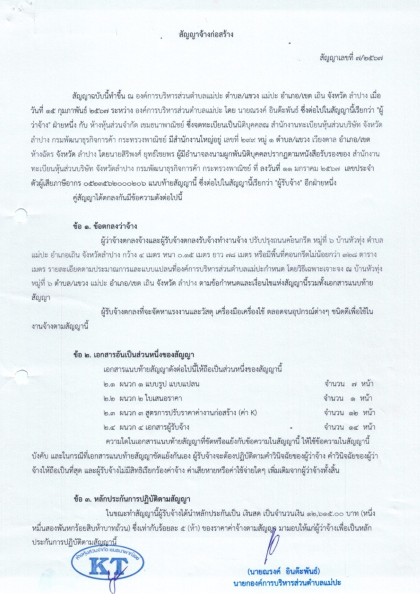 สัญญาจ้างก่อสร้าง สัญญาเลขที่ ๗/๒๕๖๗ ลงวันที่ ๑๕ กุมภาพันธ์ พ.ศ.๒๕๖๗ เรื่อง ผู้ว่าจ้างตกลงจ้างและผู้รับจ้างตกลงรับจ้างทำงานจ้าง ปรับปรุงถนนคอนกรีต หมู่ที่ ๖ ฯ โดยวิธีเฉพาะเจาะจง