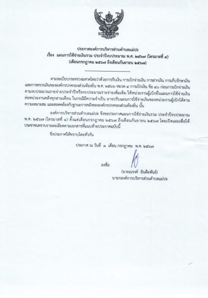 แผนการใช้จ่ายเงินรวม ประจำปีงบประมาณ พ.ศ. ๒๕๖๗ (ไตรมาสที่ ๔) (เดือนกรกฎาคม ๒๕๖๗ ถึงเดือนกันยายน ๒๕๖๗)