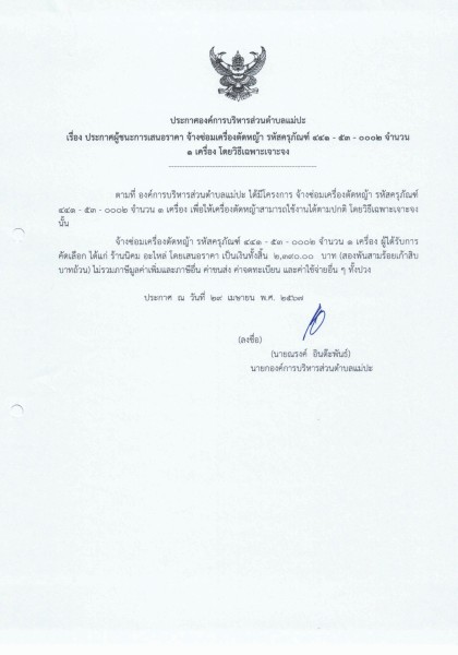 ประกาศผู้ชนะการเสนอราคา ประจำเดือน เมษายน พ.ศ.2567