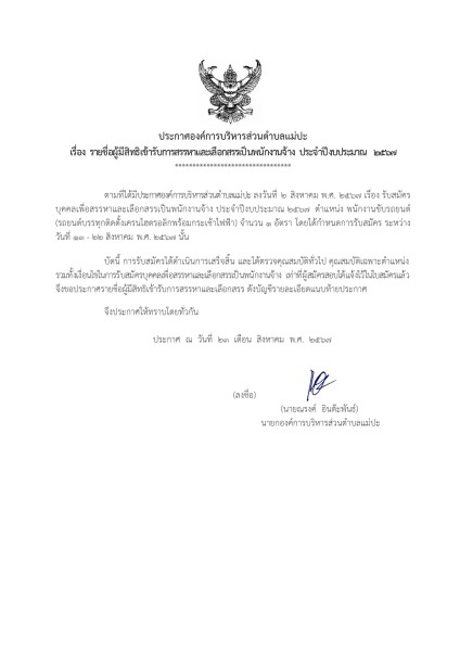 รายชื่อผู้มีสิทธิเข้ารับการสรรหาและเลือกสรรเป็นพนักงานจ้าง ประจำปีงบประมาณ ๒๕๖๗