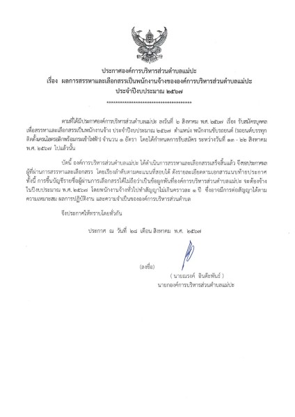 ผลการสรรหาและเลือกสรรเป็นพนักงานจ้างขององค์การบริหารส่วนตำบลแม่ปะ ประจำปีงบประมาณ ๒๕๖๗