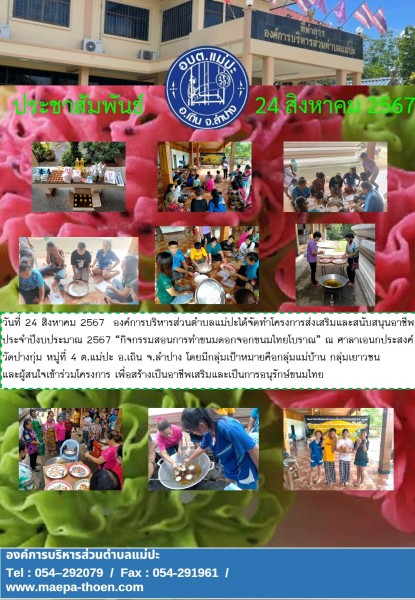 วันที่ 24 สิงหาคม 2567 องค์การบริหารส่วนตำบลแม่ปะได้จัดทำโครงการส่งเสริมและสนับสนุนอาชีพ ประจำปีงบประมาณ 2567 "กิจกรรมสอนการทำขนมดอกจอกขนมไทยโบราณ" ณ ศาลาเอนกประสงค์ วัดปางกุ่ม หมู่ที่ 4 ต.แม่ปะ อ.เถิน จ.ลำปาง โดยมีกลุ่มเป้าหมายคือกลุ่มแม่บ้าน กลุ่มเยาวชน และผู้สนใจเข้าร่วมโครงการ เพื่อสร้างเป็นอาชีพเสริมและเป็นการอนุรักษ์ขนมไทย