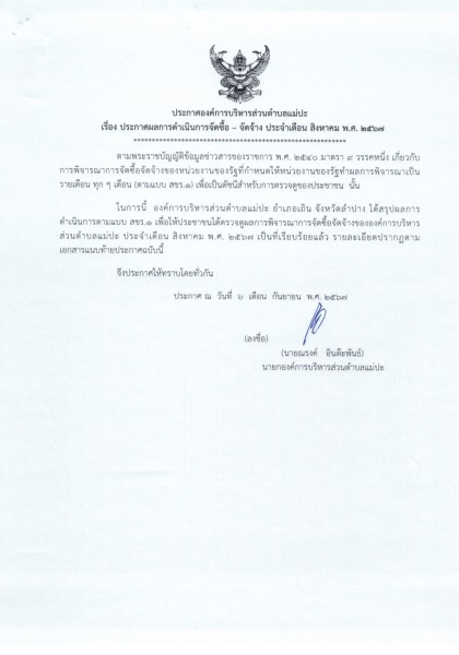 ประกาศผลการดำเนินการจัดซื้อ - จัดจ้าง ประจำเดือน สิงหาคม พ.ศ. ๒๕๖๗