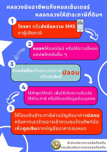 แจ้งเตือน กลลวงมิจฉาชีพแก๊งคอลเซ็นเตอร์หลอกลวงให้ชำระภาษีที่ดินฯ