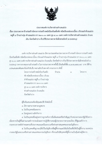 ประกวดราคาจ้างก่อสร้างโครงการก่อสร้างพนังป้องกันตลิ่งพัง ชนิดเรียงกล่องเกเบี้ยน บริเวณลำห้วยแม่ปะ หมู่ที่ ๔ บ้านปางกุ่ม ตำบลแม่ปะ ยาว ๒๐๐.๐๐ เมตร สูง ๔.๐๐ เมตร องค์การบริหารส่วนตำบลแม่ปะ อำเภอเถิน จังหวัดลำปาง ด้วยวิธีประกวดราคาอิเล็กทรอนิกส์ (e-bidding)