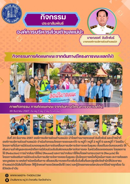 วันที่ 20 ธันวาคม 2567 องค์การบริหารส่วนตำบลแม่ปะ นำโดยนายณรงค์ อินต๊ะพันธ์ นายกองค์การบริหารส่วนตำบลแม่ปะ และเจ้าหน้าที่องค์การบริหารส่วนตำบลแม่ปะ ดำเนินกิจกรรมโครงการขยะและกไข่ ณ หมู่ที่ 1 หมู่ที่ 2 หมู่ที่ 5 และหมู่ที่ 7 โดยเป็นโครงการที่เน้นการมีส่วนร่วมของชุมชนในการขับเคลื่อนการบริหารจัดการขยะในชุมชน ตั้งแต่ในระดับครอบครัว ให้เห็นความสำคัญและตระหนักถึงการมีส่วนร่วมรับรับผิดขอบบริหารจัดการขยะ ในครัวเรือนของตนเอง โดยลดการใช้ (Reduction) การนำกลับมาใช้ใหม่ (Reused) และการนำกลับมาใช้ใหม่โดยผ่านกระบวนการ (Recycle) ซึ่งโครงการส่งเสริมการมีส่วนร่วมในการบริหารจัดการขยยะในชุมชน เป็นโครงการหนึ่งที่มุ่งเน้นการลด ละการคัดแยกขยะมูลฝอย ณ แหล่งกำเนิดหรือต้นทาง เพื่อลดปริมาณขยะที่จะเพิ่มขึ้นในพื้นที่และปลูกฝังจิตสำนึกให้ประชาชนตำบลแม่ปะมีนิสัยไม่ทิ้งขยะ ให้รู้จักคณค่าของวัสดเหลือใช้ (ขยะ) และรู้จักแยกขยะแต่ละประเภทได้อย่างถูกต้อง ในชีวิตประจำวัน