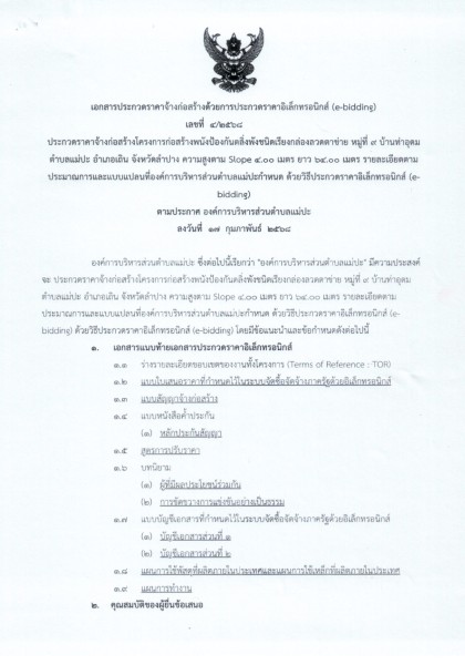 ประกวดราคาจ้างก่อสร้างโครงการก่อสร้างพนังป้องกันตลิ่งพังชนิดเรียงกล่องลวดตาข่าย หมู่ที่ ๙ บ้านท่าอุดม ตำบลแม่ปะ อำเภอเถิน จังหวัดลำปาง ความสูงตาม Slope ๔.๐๐ เมตร ยาว ๖๔.๐๐ เมตร รายละเอียดตาม ประมาณการและแบบแปลนที่องค์การบริหารส่วนตำบลแม่ปะกำหนด ด้วยวิธีประกวดราคาอิเล็กทรอนิกส์ (e-bidding) ตามประกาศ องค์การบริหารส่วนตำบลแม่ปะ