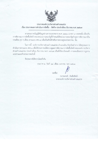 ประกาศผลการดำเนินการจัดซื้อ - จัดจ้าง ประจำเดือน ธันวาคม พ.ศ. ๒๕๖๗