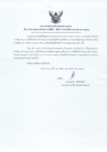 ประกาศผลการดำเนินการจัดซื้อ - จัดจ้าง ประจำเดือน มกราคม พ.ศ. ๒๕๖๘
