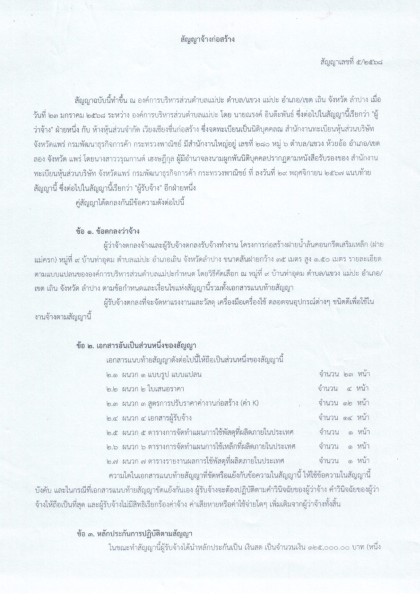 สัญญาจ้างก่อสร้าง สัญญาเลขที่ ๕/๒๕๖๘ ลงวันที่ ๒๓ มกราคม พ.ศ.๒๕๖๘ เรื่อง ผู้ว่าจ้างตกลงจ้างและผู้รับจ้างตกลงรับจ้างทำงาน โครงการก่อสร้างฝายน้ำล้นคอนกรีตเสริมเหล็ก (ฝายแม่ครก) หมู่ที่ ๙ บ้านท่าอุดมฯ โดยวิธีเฉพาะเจาะจง