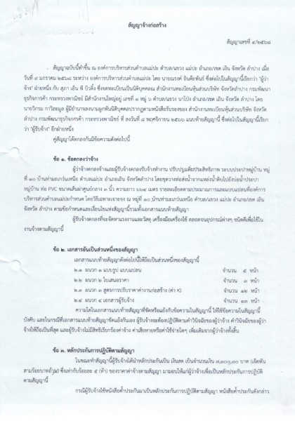 สัญญาจ้างก่อสร้าง สัญญาเลขที่ ๕/๒๕๖๘ ลงวันที่ ๙ มกราคม พ.ศ.๒๕๖๘ เรื่อง ผู้ว่าจ้างตกลงจ้างและผู้รับจ้างตกลงรับจ้างทำงาน ปรับปรุงเพิ่มประสิทธิภาพ ระบบประปาหมู่บ้าน หมู่ที่ ๑๐ บ้านท่ามะเกว๋นเหนือฯ โดยวิธีเฉพาะเจาะจง