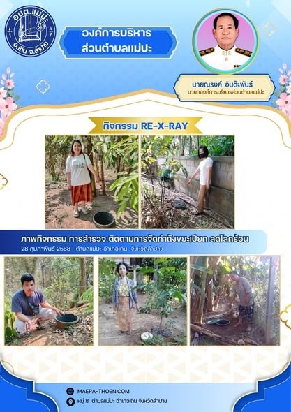 องค์การบริหารส่วนตำบลแม่ปะ อำเภอเถิน จังหวัดลำปาง ดำเนินกิจกรรมการสำรวจติดตามการจัดทำถังขยะเปียก ลดโลกร้อนขององค์กรปกครองส่วนท้องถิ่นอย่างต่อเนื่อง เป็นประจำทุกปี และเป็นไปตามแผนปฏิบัติการเชิงกลยุทธ์แนวใหม่ RE-X-RAY