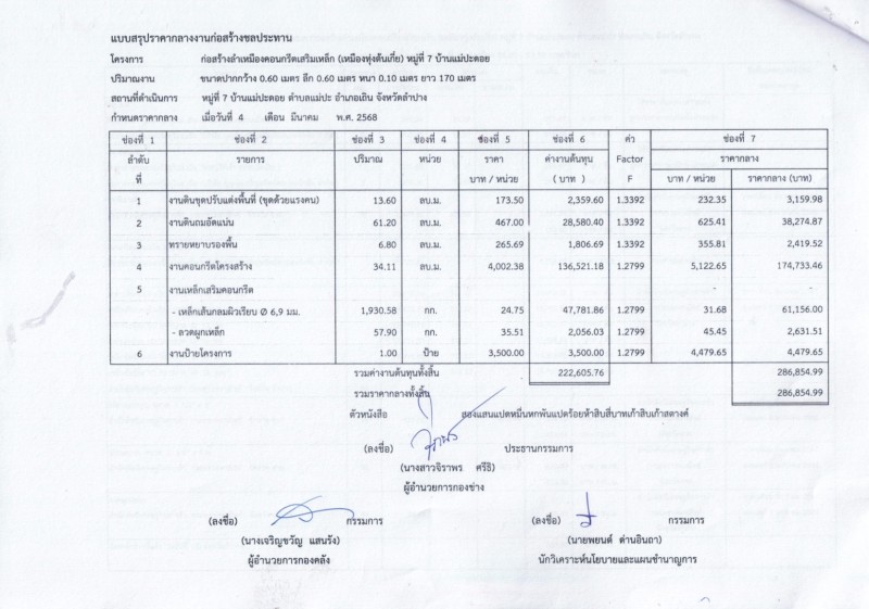 แบบสรุปราคากลางงานก่อสร้างชลประทาน ก่อสร้างลำเหมืองคอนกรีตเสริมเหล็ก (เหมืองทุ่งต้นเกี๋ย) หมู่ที่ 7 บ้านแม่ปะดอย