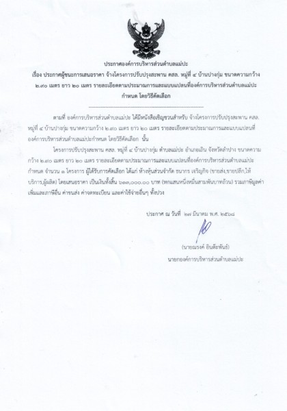 ประกาศผู้ชนะการเสนอราคา จ้างโครงการปรับปรุงสะพาน คสล. หมู่ที่ ๔ บ้านปางกุ่ม ขนาดความกว้าง ๒.๙๐ เมตร ยาว ๒๐ เมตร รายละเอียดตามประมาณการและแบบแปลนที่องค์การบริหารส่วนตำบลแม่ปะกำหนด โดยวิธีคัดเลือก