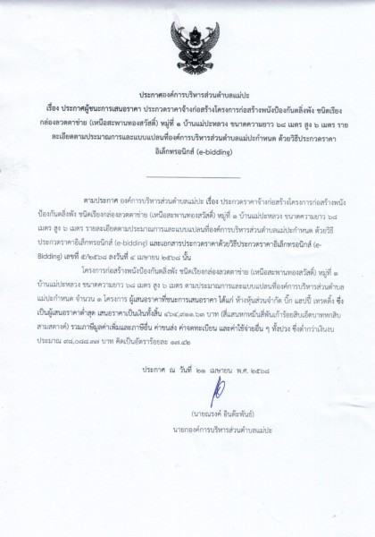 ประกาศผู้ชนะการเสนอราคา ประกวดราคาจ้างก่อสร้างโครงการก่อสร้างพนังป้องกันตลิ่งพัง ชนิดเรียงกล่องลวดตาข่าย (เหนือสะพานทองสวัสดิ์) หมู่ที่ ๑ บ้านแม่ปะหลวง ขนาดความยาว ๖๘ เมตร สูง ๖ เมตร รายละเอียดตามประมาณการและแบบแปลนที่องค์การบริหารส่วนตำบลแม่ปะกำหนด ด้วยวิธีประกวดราคาอิเล็กทรอนิกส์ (e-bidding)