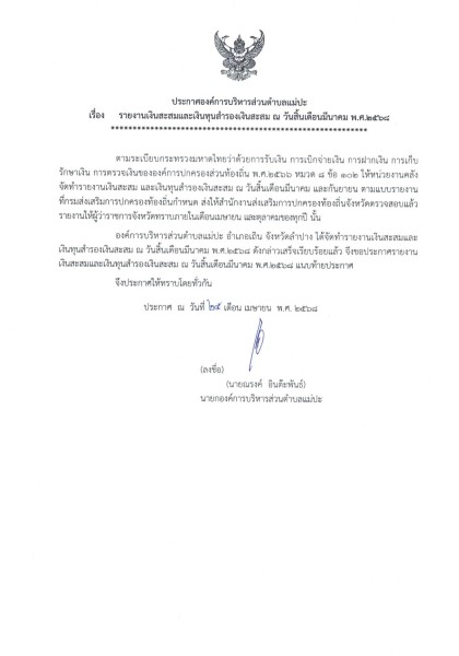 รายงานเงินสะสมและเงินทุนสำรองเงินสะสม ณ วันสิ้นเดือนมีนาคม พ.ศ.๒๕๖๘