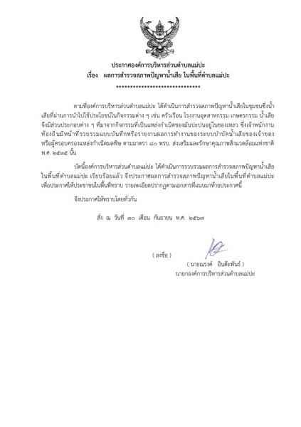 ผลการสำรวจสภาพปัญหาน้ำเสีย ในพื้นที่ตำบลแม่ปะ