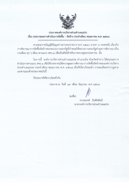 ประกาศผลการดำเนินการจัดซื้อ - จัดจ้าง ประจำเดือน พฤษภาคม พ.ศ. ๒๕๖๘