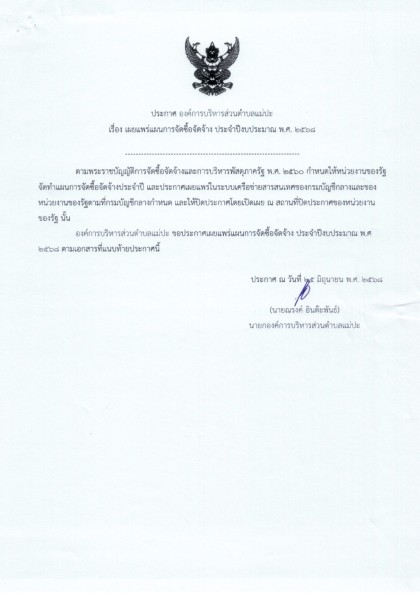 เผยแพร่แผนการจัดซื้อจัดจ้าง ประจำปีงบประมาณ พ.ศ. ๒๕๖๘ โครงการก่อสร้างพนังป้องกันตลิ่งพัง ชนิดเรียงกล่องลวดตาข่าย บริเวณลำห้วยแม่ปะ หมู่ที่ ๔ ฯ