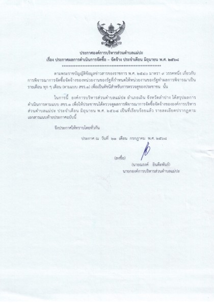 ประกาศผลการดำเนินการจัดซื้อ - จัดจ้าง ประจำเดือน มิถุนายน พ.ศ. ๒๕๖๘