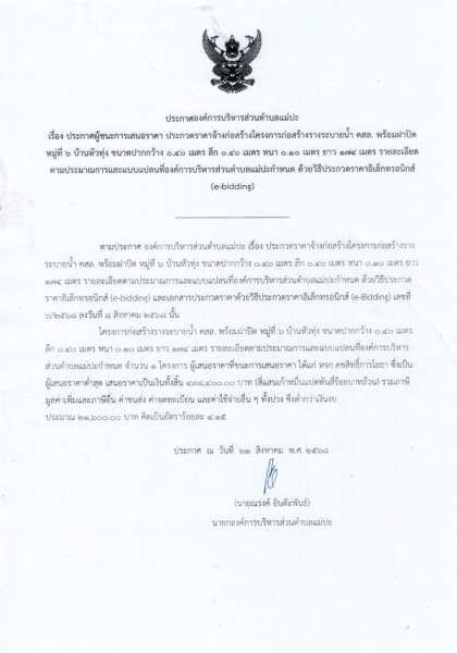 ประกาศผู้ชนะการเสนอราคา ประกวดราคาจ้างก่อสร้างโครงการก่อสร้างรางระบายน้ำ คสล. พร้อมฝาปิด หมู่ที่ ๖ บ้านหัวทุ่ง ขนาดปากกว้าง ๐.๔๐ เมตร ลึก ๐.๔๐ เมตร หนา ๐.๑๐ เมตร ยาว ๑๗๔ เมตร รายละเอียดตามประมาณการและแบบแปลนที่องค์การบริหารส่วนตำบลแม่ปะกำหนด ด้วยวิธีประกวดราคาอิเล็กทรอนิกส์ (e-bidding)