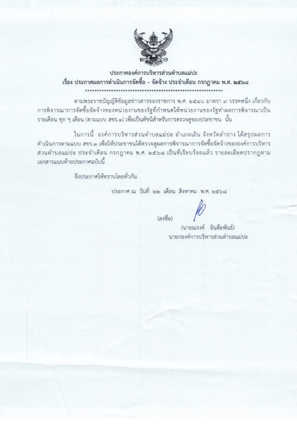 ประกาศผลการดำเนินการจัดซื้อ - จัดจ้าง ประจำเดือน กรกฎาคม พ.ศ. ๒๕๖๘