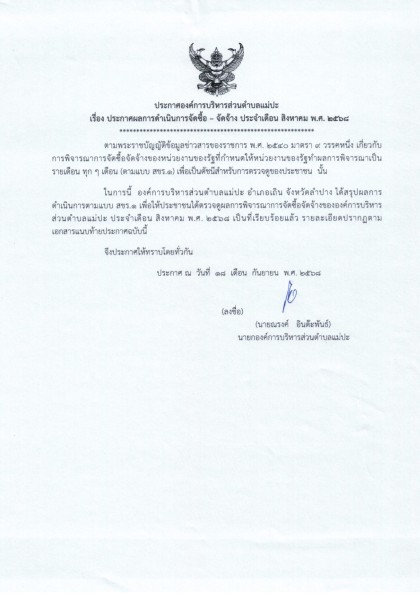 ประกาศผลการดำเนินการจัดซื้อ - จัดจ้าง ประจำเดือน สิงหาคม พ.ศ. ๒๕๖๘