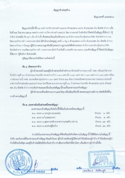 สัญญาจ้างก่อสร้าง สัญญาเลขที่ ๑๗/๒๕๖๘ ลงวันที่ ๒๕ กันยายน พ.ศ.๒๕๖๘ เรื่อง ผู้ว่าจ้างตกลงจ้างและผู้รับจ้างตกลงรับจ้างทำงาน จ้างก่อสร้างรางระบายน้ำ คสล. พร้อมฝาปิด สายห้วยโป่ง หมู่ที่ ๑๐ บ้านท่ามะเกว๋นเหนือ ฯ โดยวิธีเฉพาะเจาะจง