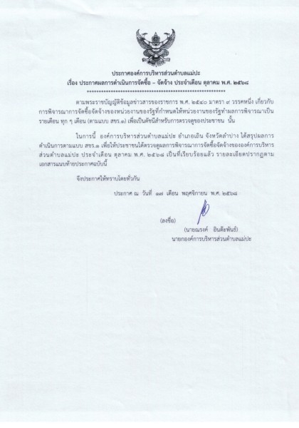 ประกาศผลการดำเนินการจัดซื้อ - จัดจ้าง ประจำเดือน ตุลาคม พ.ศ. ๒๕๖๘
