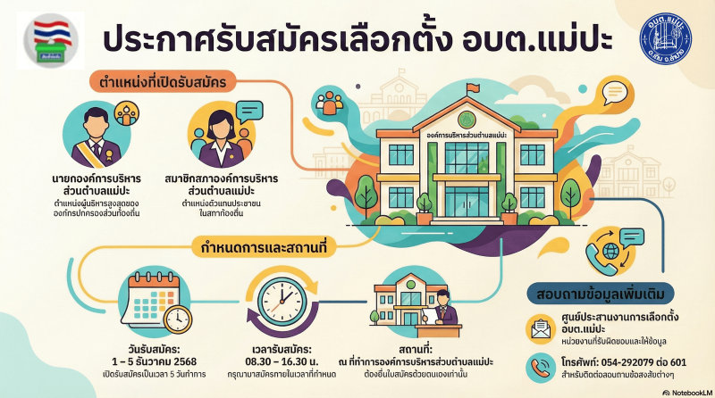 📣 การรับสมัคร สมาชิกสภาองค์การบริหารส่วนตำบลแม่ปะ และนายกองค์การบริหารส่วนตำบลแม่ปะ โดยมีกำหนดการรับสมัครระหว่าง วันที่ 1 ถึง 5 ธันวาคม 2568 ในช่วงเวลา 08.30 ถึง 16.30 น. ผู้สนใจต้อง ยื่นใบสมัครด้วยตนเอง ณ ที่ทำการองค์การบริหารส่วนตำบลแม่ปะ ติดต่อสอบถามได้ที่ ศูนย์ประสานงานการเลือกตั้ง อบต.แม่ปะ โทร. 054-292079 ต่อ 601