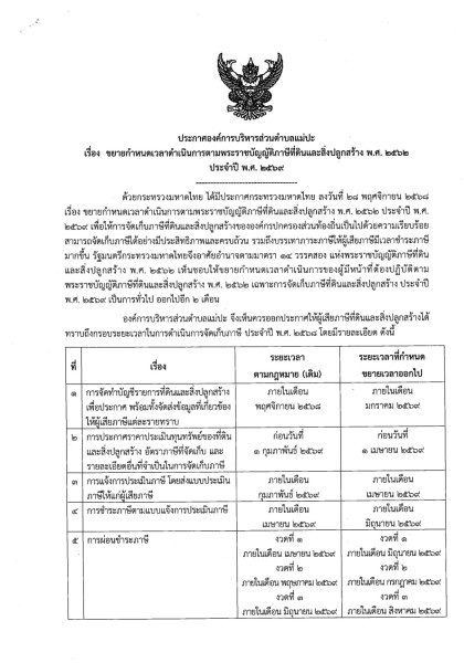 จึงขอให้ประชาชนผู้เป็นเจ้าของที่ดินและสิ่งปลูกสร้างในเขตตำบลแม่ปะ อ.เถิน จ.ลำปาง โปรดตรวจสอบรายละเอียดของกำหนดเวลาใหม่ตามเอกสารแนบ เพื่อดำเนินการชำระภาษีให้ถูกต้องและทันตามกำหนด