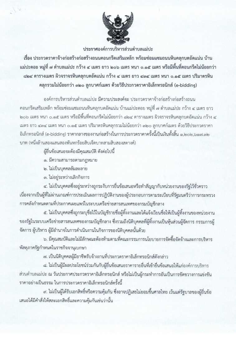 ประกวดราคาจ้างก่อสร้างก่อสร้างถนนคอนกรีตเสริมเหล็ก พร้อมซ่อมแซมถนนหินคลุกบดอัดแน่น บ้านแม่ปะดอย หมู่ที่ ๗ ตำบลแม่ปะ กว้าง ๔ เมตร ยาว ๒0๖ เมตร หนา 0.๑๕ เมตร หรือมีพื้นที่คอนกรีตไม่น้อยกว่า ๘๒๔ ตารางเมตร ผิวจราจรหินคลุกบดอัดแน่น กว้าง ๔ เมตร ยาว ๔๓๔ เมตร หนา ๐.๑๕ เมตร ปริมาตรหินคลุกรวมไม่น้อยกว่า ๓๒ㆍ ลูกบาศก์เมตร ด้วยวิธีประกวดราคาอิเล็กทรอนิกส์ (e-bidding)