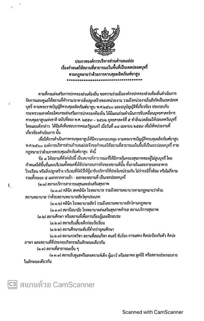 กำหนดให้สถานที่สาธารณในพื้นที่เป็นเขตปลอดบุหรี่ตามกฎหมายว่าด้วยการควบคุมผลิตภัณฑ์ยาสูบ
