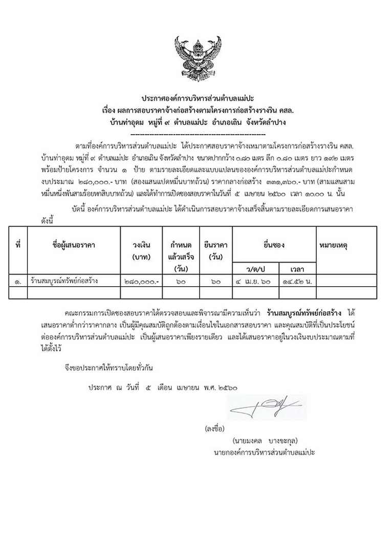 เรื่อง ผลการสอบราคาจ้างก่อสร้างตามโครงการก่อสร้างรางริน คสล. บ้านท่ามะเกว๋นเหนือ หมู่ที่ ๑๐ ตำบลแม่ปะ อำเภอเถิน จังหวัดลำปาง